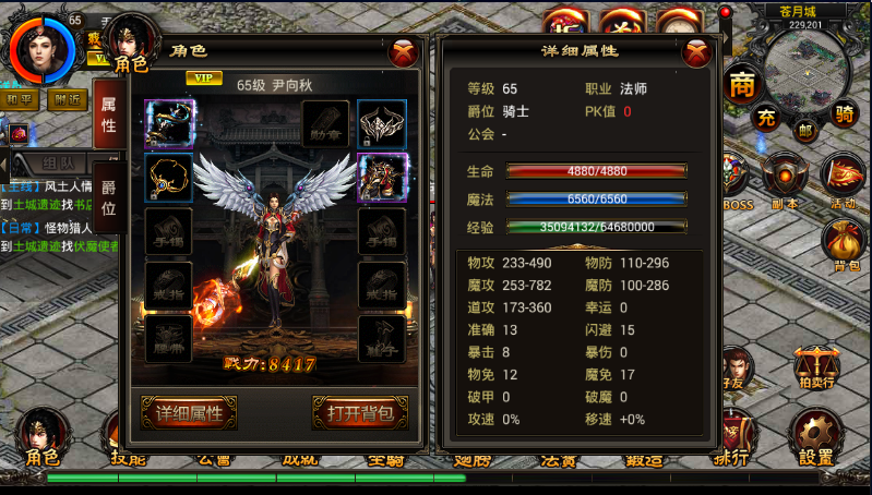 角色界面左侧为装备栏,右侧为角色攻击、防御等详细属性。
