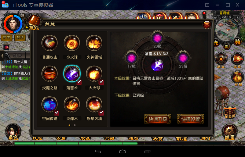 技能的升级和使用频率有关系,使用得越频繁,升级所需要的熟练度越多。也可以在商城购买技能秘药快速升级,点击“快速升级”即可。