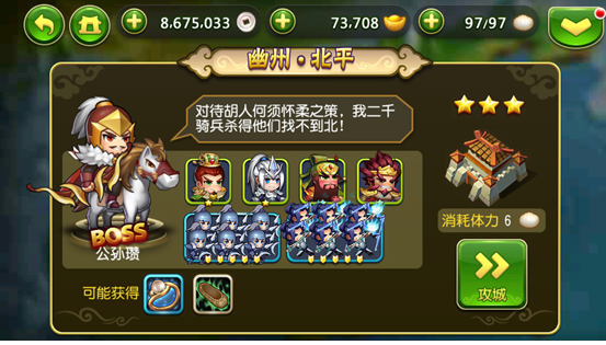 北平郡,其前身为右北平郡,战国时期燕国置,东汉时移治土垠。 “广居右北平。” ——《史记·李将军列传》 【副本介绍】 防守兵种:LV18枪兵兵团、LV18弓箭手兵团 防守武将:LV18刘备、LV18..