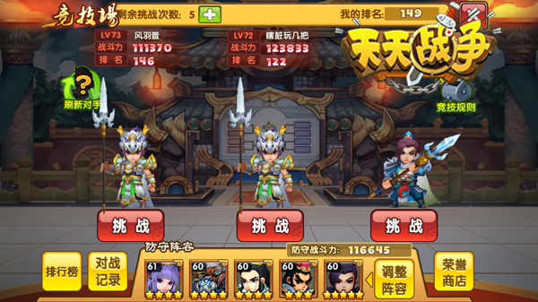 《天天战争》中除了日常的副本之外,竞技场是天天个人觉得比较有意思的地方,在这里是见证我们实力的地方!竞技场在主角升级到10级开放,一个合适的阵容有时候比强大的战斗力更能让我们取得优势,那么,我们怎么样才能在竞技场中取胜呢?想知道的主公们不要错过接下来的竞技场的介绍啦!