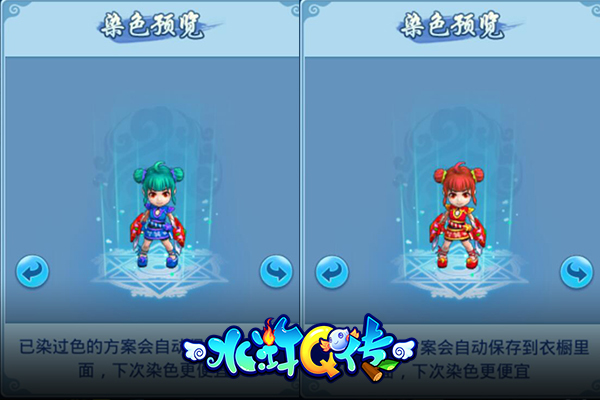 都说每一种颜色都代表一种心情,在《水浒Q传》中就可以变化各种颜色来彰显自己的个性!通过染色功能,你可以自由改变自己头发、服饰的颜色,任性做自己!染色的话会用到五彩丹和七彩丹,玩家可以再商城中获得。