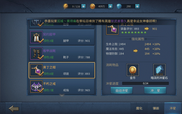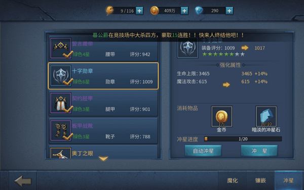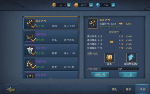 看上图,攻击属性部件拉出来优先升星,武器、十字勋章、项链、戒指。满八星以后,继续优先这四件,以此类推!