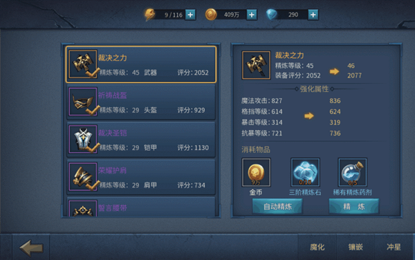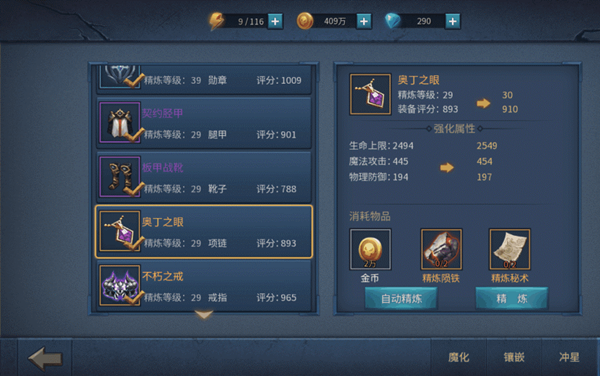 看上图,攻击属性部件拉出来优先精炼,武器、十字勋章、项链、戒指。