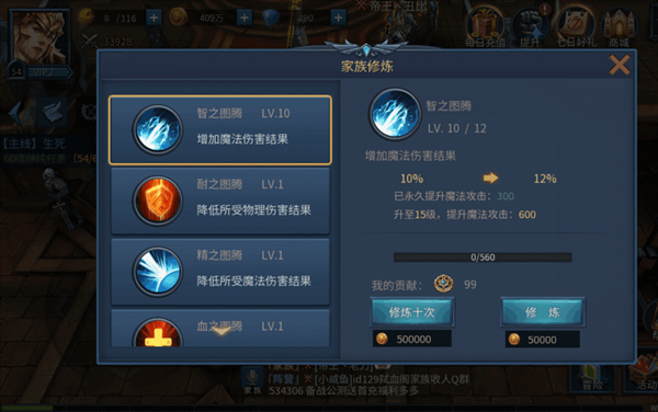 家族技能修炼,优先攻击属性,打开界面之后会有详细的档位加成说明。经过个人测试得出结论,点五万那档速度狂点,暴击多多,最好别点十倍的,偷懒是要付出代价的!看上图,重点在文字说明那里,10%永久加攻击300。