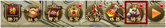 宠物系统通过主线任务开启,系统开启后玩家点击主界面右下角三角按钮,然后点击“骑宠”按钮进入。