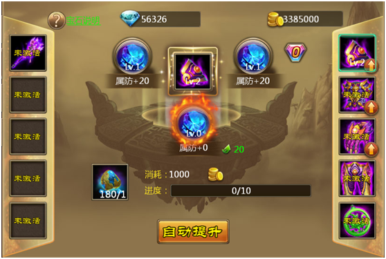 所有装备都有3个宝石孔,每个装备对应一种宝石属性,需要激活提升宝石等级增加属性。首次提升宝石就可以激活宝石孔的属性。同时,当镶嵌的宝石达到一定条件时,可以获得阶段属性加成。