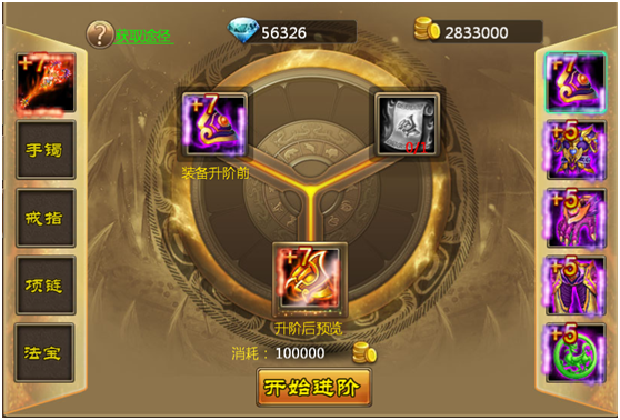 装备到达紫色+7或橙色+9可以进行装备进阶升级,进阶后颜色外貌发生变化,并且增加装备属性。其中,进阶消耗需要消耗进阶卷轴。