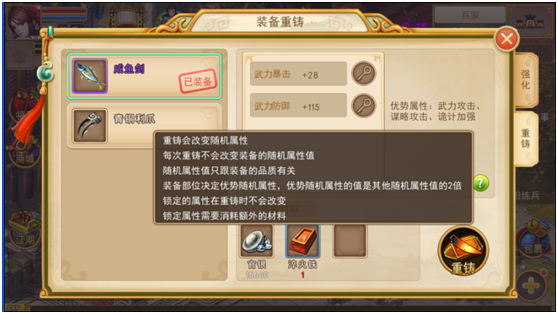2、每次重铸消耗一定的游戏币与道具,重新随机所有的随机属性,消耗根据装备的品质不同而不同;