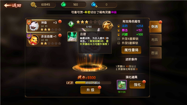 灵兽上阵的时候要注意,不同阵法位置带给角色的属性加成比例都是不一样的哦,点击右下角的属性按钮可以查看当前角色一共获得了多少加成。