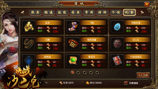 打开《决战沙巴克》的商城界面,玩家们能够看到琳琅满目各式各样的商品道具。虽然其中很多道具,需要玩家们花费元宝来进行购买。但商城之中还有一个强大的礼券商店。这里的所有物品简直是平价大放送,所有的玩家们都能够买哦!