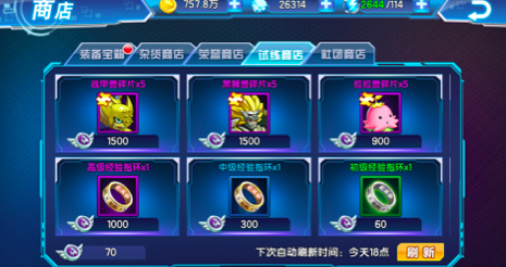 试炼商店中还可以使用试炼币兑换各种数码兽的碎片,饰品升级材料等。