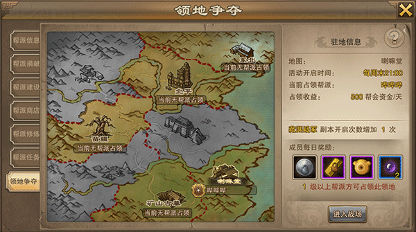 领地争夺是帮派之间的PVP玩法,开启时间是周六21:00开启。帮战无等级限制,只要在帮派中就可以参加战斗。帮派可以占领的地图和帮派等级有关,帮派达不到该地图所需帮派等级则不能占领。领地争夺中占领该地图的帮派每天会根据地图获得不同的帮会资金。帮派成员也可以获得相应的奖励。