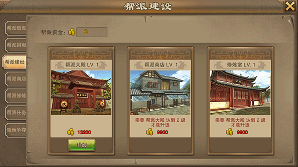 帮派建设分为帮派大殿、帮派商店、帮派修炼室,帮派大殿等级决定帮派商店和修炼室的可升级等级