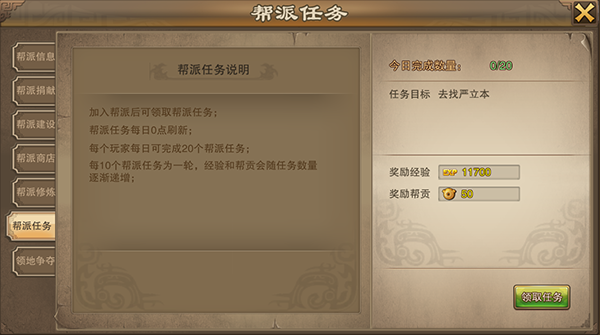 每天可以领取20个帮派任务,做任务可获得帮贡和经验。
