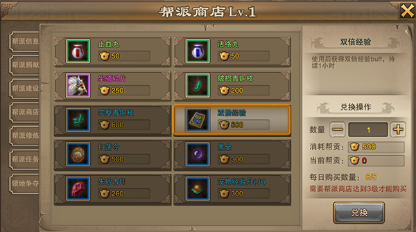 帮派商店等级越高,商店可购买的物品越多,商店购买消耗帮贡。