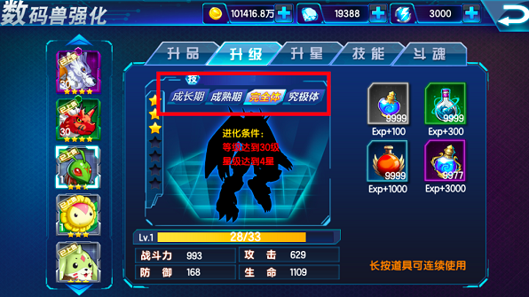 在数码兽强化的界面,大家可以看到数码兽名字下面有一排字:成长期、成熟期、完全体、究极体。