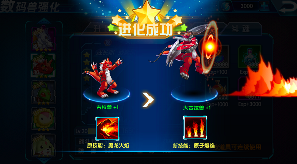 点击进化之后,数码兽会就会进化到下一阶段,进化带来的不仅仅是外观上的改变,更能进化数码兽的必杀技能。