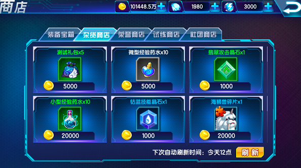 除了神秘商店外早其他商店内都会出售经验药水、装备强化材料、数码兽碎片等道具,每天商店内的物品会自动刷新,当天也可以花费钻石进行刷新,每次刷新都会随机刷新一种英雄碎片。