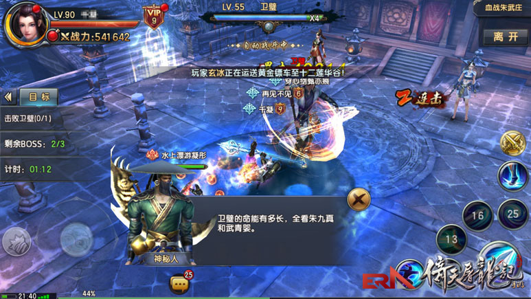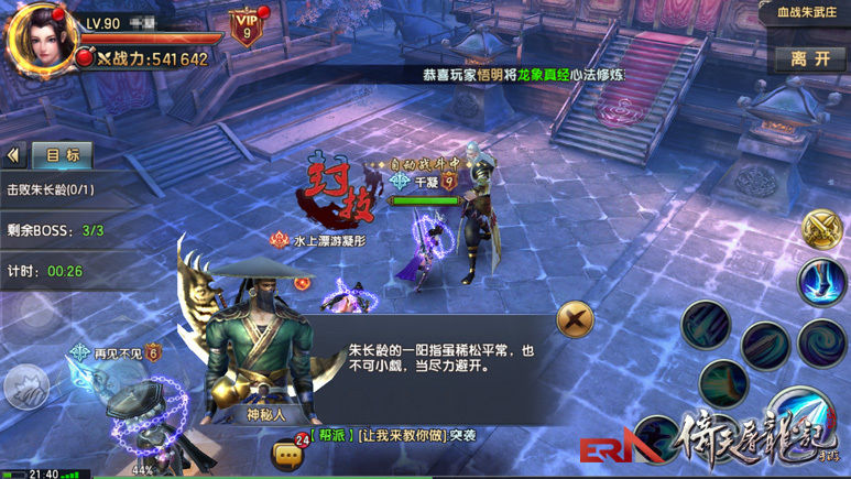 在清理掉沿途的小喽啰之后,就能看到第一个Boss朱长龄啦,神秘人出现告诫各位虽然朱长龄的武功虽然不咋地,但是也要稍微注意一下,随意躲躲技能什么的~朱长龄有个封技的技能,这期间得硬抗了。其他没什么技巧站撸即可~