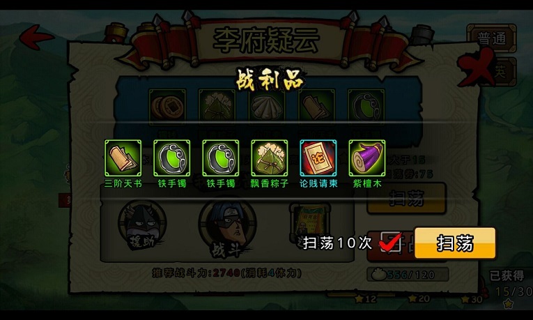 点击扫荡选项后,会提示战利品,点击下方扫荡按钮即可完成扫荡,如果您需要多次对同一副本进行扫荡,可以勾选下方的扫荡10次按钮再进行扫荡哦。