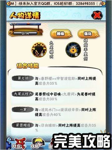 每个忍者都可以装备一件武器和一件防具,技能分为两大类,左侧为主动技能,右侧为被动技能,不要误以为会有什么元神配合你发动一些惊天动地的组合技能,这里的组合技能只是一些提升角色属性的被动技能,主要是通过上阵忍者的搭配来激活对应的技能。试想当你鸣人快要超神的时候,却没有日向雏田在他身边为他激活35%的攻击力BUFF,这是多么令人伤感的一件事啊,赶快行起来让他们早日团圆吧。