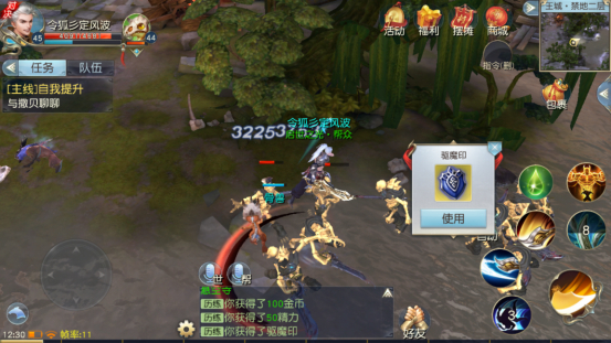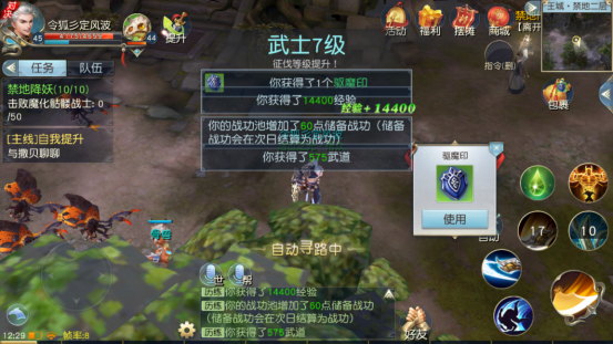 组队前往对应等级的禁地驱散妖魔将有几率获得驱魔印,使用后获得武道和战功奖励。