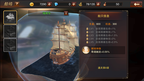第二种就是通过材料碎片对船体进行强化,强化船体能为海盗船增加属性,海盗船属性的增加能让海盗船在贸易挑战中负重更多货品。
