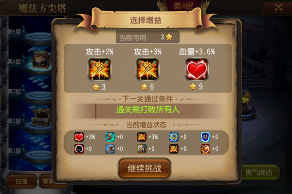 方尖塔的前10层,我们都要选择3星过关,因为前期能够最快的去换到蓝装,蓝装在竞技场中将提供非常大的优势。在BUFF选择方面需要根据自己队伍的属性来进行选择。