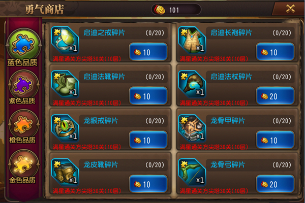方尖塔每天可以免费重置一次,VIP10可免费重置2次。每个关卡的通关条件不一样,但是满星均为9颗星,紫装的兑换条件必须要满星通关(30层),则才有资格购买紫色装备。则橙装的兑换条件是需要满星通关(50层)。橙装需要40个碎片才能合成。
