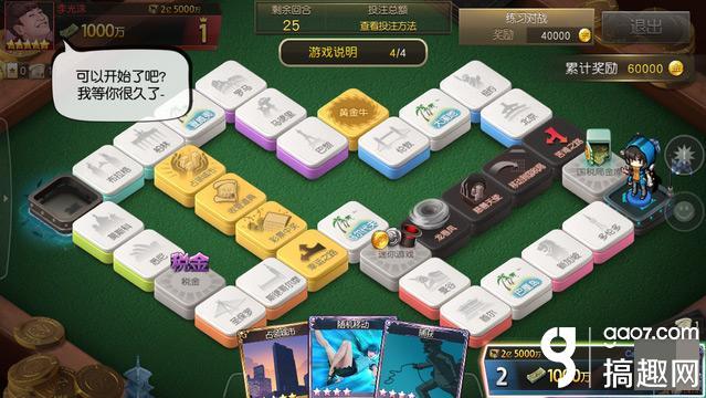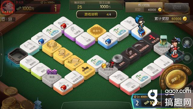 本作的玩法与国民级游戏《大富翁》相似,并且游戏一开始会有详尽的新手教程,指导玩家如何游戏。所有玩家都需要将自己所控制的角色固定在棋盘之上,通过骰子摇出点数来进行移动,如果玩家移动到的棋盘格正好无人占据,那么这块地方就自动变为玩家的地产,而如果不行走到了对手的地盘之上,那么想要全身而退就只能交一些过路费了。游戏采用回合制,玩家每成功在棋盘上完整移动一次,都会让己方的地产升级,所收取的过路费也会更高。当然除了投身地产界之外,游戏中的一些惩罚手段或者小游戏也非常考验玩家的运气。最后再加上能够获得更多收益的度假村以及金牛BUFF,整个游戏在玩法上相当丰富。此外,游戏中也分为单人战和组队战,并且会根据玩家现有资金的多少分为新手组、大师组等分组,想要跨级挑战,就必须要花上100钻石购买门票。