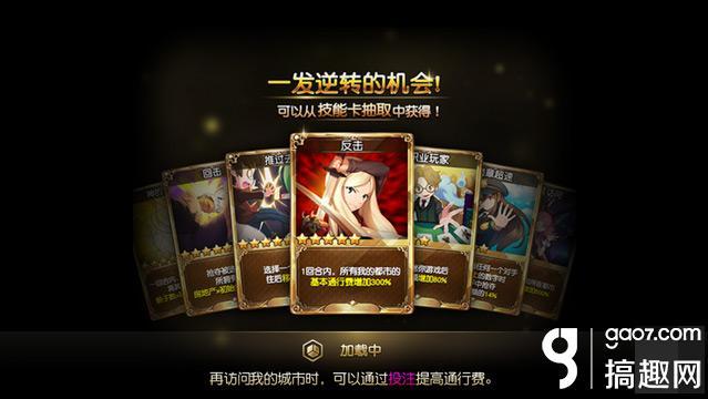 《富翁时代》中的卡牌系统,算得上是其最有特色的一方面内容,并且开发者也对外宣称,游戏在玩法方面相比《大富翁》要更具有策略性,而这种策略就集中体现在卡牌的使用上。卡牌就相当与我们常说的技能。游戏中,玩家可以在54种不同技能卡中选取3张参与比赛。卡片类型种类非常丰富,有攻击卡(如夺取:有几率直接强制收管对方城市等),辅助卡(如祝福之行军,移动后经过城市等级提升等),移动卡(如移动到异次元:选择角色移动任意位置等),防御卡(如开始事件调查:对方若干回合无法接收指定城市等)多种类型。54张技能卡能能自由组合出数千种搭配,不过也正因卡牌数量的众多,想要将其全部收集完毕,时间和金钱就成了必备的了。