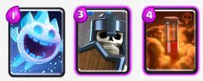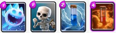 骷髅守卫是目前这套卡组在防御上能够抵挡对手进攻的卡牌,只是这骷髅守卫充当吸引火力的目标,配合冰精灵的冷冻,让对手的部队就这样被防御塔加这个组合给抵挡了。如果遇到一大波,那么再加个毒药就行了。数量越多,毒药起的作用就越大。