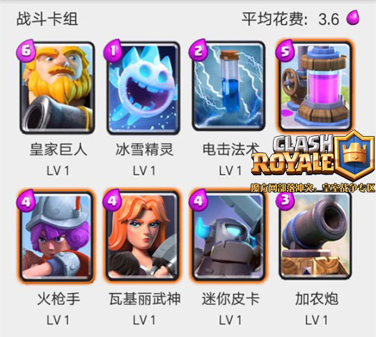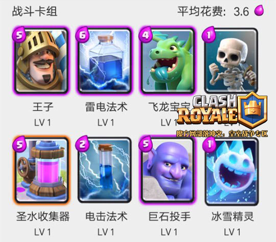 卡组要点:王子、小闪电、飞龙宝宝、巨石投手!4张被修改过的卡牌。有削弱有增强,总的来说,王子的攻击力得到了提高,卡组的输出能力也得到了提高,巨石投手费用调低,因此这套卡组尽管携带了3张5费以上的卡牌,总体费用都不会很高,3.6配合采集器,已经足够灵活。另外的冰雪精灵骷髅兵,都是实用不贵的解场辅助神器。
