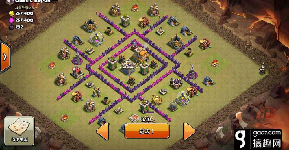 我们首先来看下这个阵,首先是布置比较松散,使用龙流即使把防空等推平也因为时间不够而不能拿到三星。