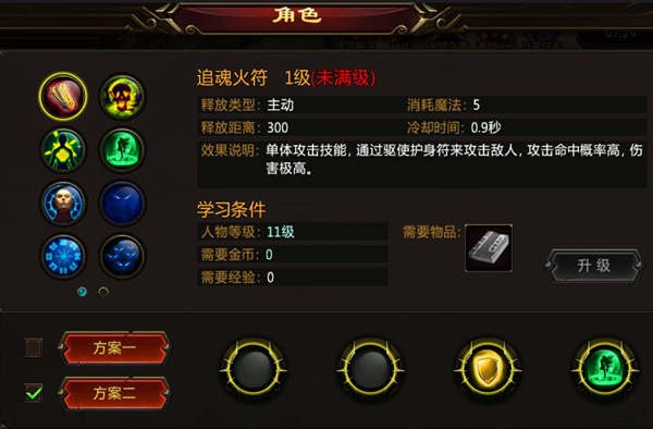 道士给人的印象就是那条既可爱又能抽的狗,但其实道士自己本身也有很多技能,比如追魂火符,怎么设置呢?点击左上角人物头像,进入角色,点击技能,在下方选择“方案一”,然后点一下追魂火符,最后点一下“方案一”旁边的空格,位置随便,看自己喜好,这样技能一就设置好了。