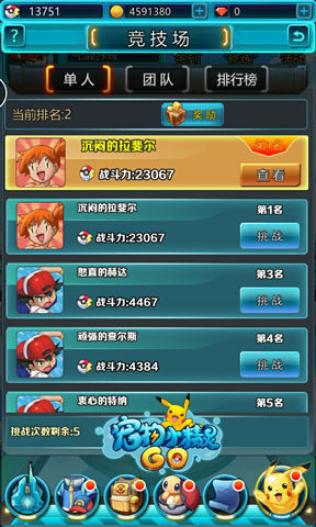 《宠物小精灵GO》游戏中当玩家等级达到10级以后可进入单人竞技场,系统根据玩家当前等级推送五个排名在玩家以上的对手供玩家选择挑战,每天可免费挑战五次,如果小伙伴们还是觉得不过瘾,可通过消耗钻石购买额外的挑战次数。如果在竞技场中挑战胜利,可以将对手的排名甩在屁股后面。