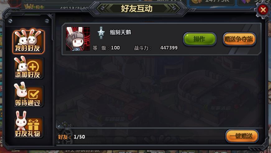 在我的好友里可以看到自己当前的好友并可以通过赠送争夺旗来赠送好友争夺旗,通过点击操作按钮可以查看好友的出战阵容,给好友留言还可以通过对好友的屏蔽来屏蔽好友的留言等。也可以对好友进行删除,在添加好友功能中可以通过搜索功能来搜索想要找的朋友,也可以添加系统推荐的好友,通过对该好友的邀请来进行好友的添加,当该好友通过验证请求时双方即成为了好友。等待通过功能是好友发送的好友邀请等待自己通过的一个功能。好友礼物功能可以领取好友赠送的争夺旗,不过当自己的争夺旗数量到达20时便不可以领取了。