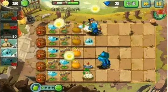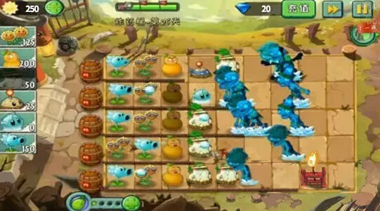 一排向日葵、一排寒冰射手、外加一排火葫芦的攻击,我们的阵型就基本稳定了,遇到铁通僵尸时,记得提前种下土豆地雷来对付它们。