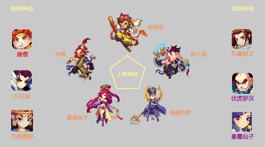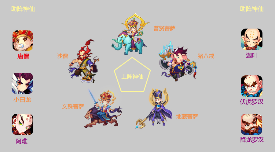 布阵:主角+(八戒、普贤菩萨、文殊菩萨、沙僧、地藏菩萨)