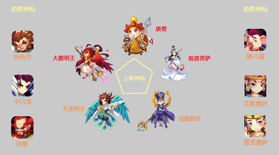 布阵:主角+(大鹏明王、唐僧、观音菩萨、孔雀明王、地藏菩萨)