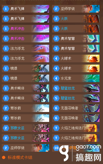 打法:首先我们需要明确的是我们是一套快攻类型的卡组,虽然我们有萨隆,但那是最后的自保手段,我们需要在前期尽量让浮龙获得成长,以此来抢的更多的血量,然后依靠火妖的伤害输出和我们比较多的直伤法术来获得胜利,一般情况下解场尽量使用奥术冲击,能够打直伤的法术可以选择性的留下来。需要注意的就是浮龙的成长和火妖的伤害输出。