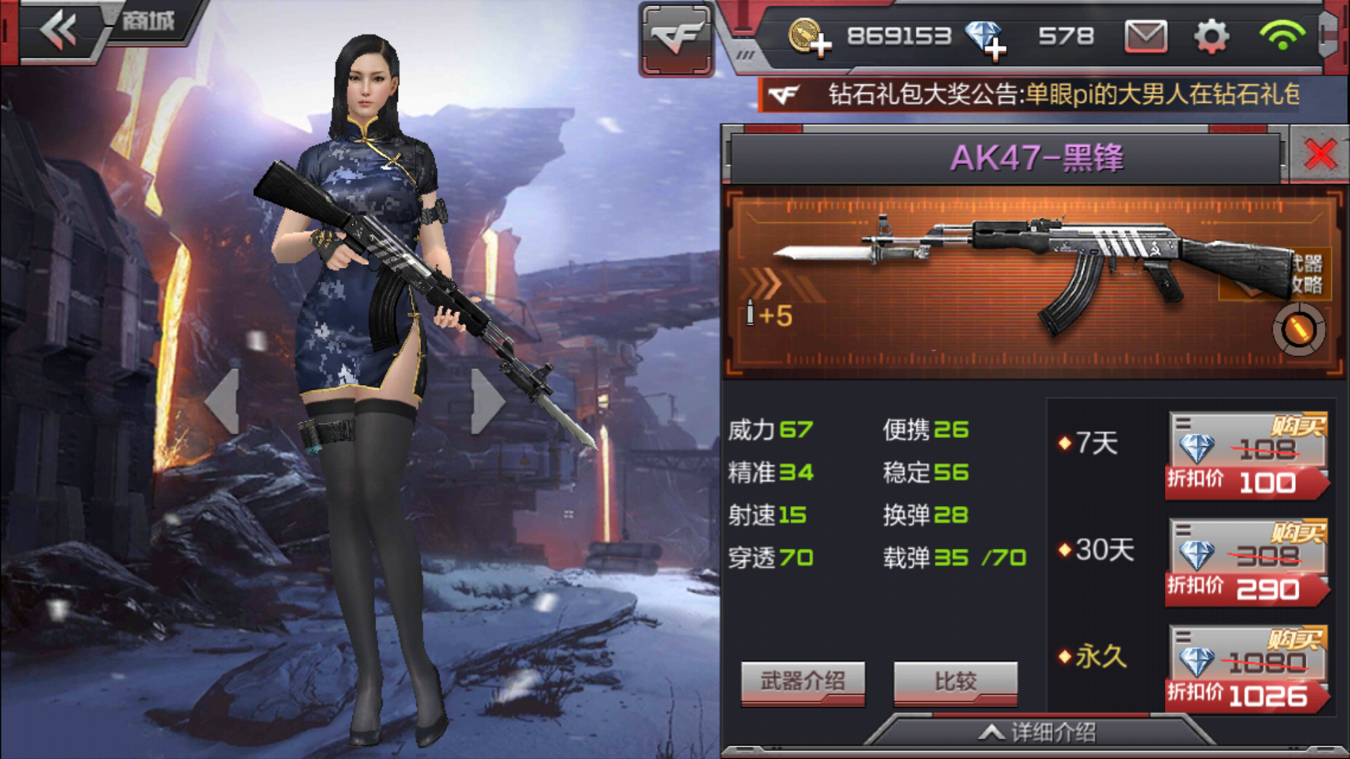 如果说M4A1枪王荣耀时高调华丽,那么AK47黑锋则是低调内敛。虽然不像M4那样光芒四射,但没有人敢质疑它的性能。更何况这两把武器的价格又有这么大的差距,所以对于那些经济条件一般的小伙伴来说,AK47黑锋无疑是更好的选择。
