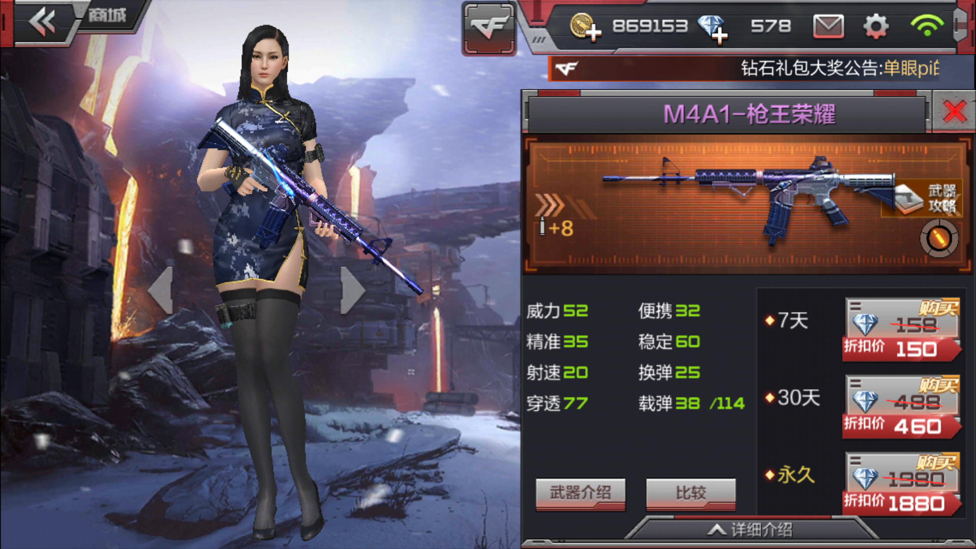 全新推出的M4A1枪王荣耀与以往的M4A1外形有了很大变化,上提把被取消,取而代之的则是机械照门,这使得整枪外观更加干练。而且因为是枪王荣耀套装,还有额外的光效,身为外貌协会的小编,对这款神器简直要流口水啊!