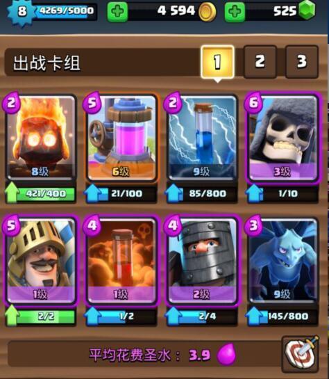 这个是低阶比较常见的卡组,利用巨人的肉配合王子的的输出打出有效的一波进攻,并且王子的冲锋可以提高前排巨人的移动速度,同时后排的亡灵和火枪手可以很好的保护我们不被敌方空中卡困扰,毒药法术这个卡牌更是可攻可守,也是我们后期进攻的核心辅助卡。