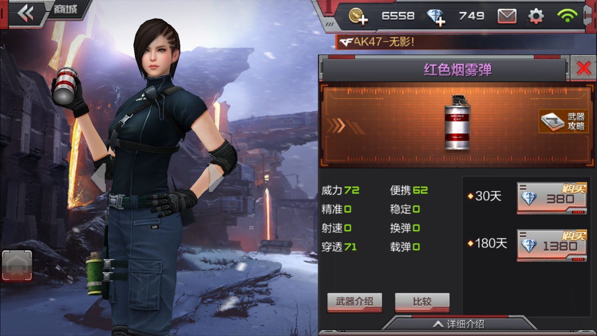 穿越火线枪战王者更新之后推出全新的红色的烟雾弹,30天的价格为380钻石,180天的价格为1380,这样的价格让很多的玩家不敢去入手这个红色的烟雾弹,接下来跟着小编一起看看红色烟雾弹的介绍,你就会知道这叫物有所值。