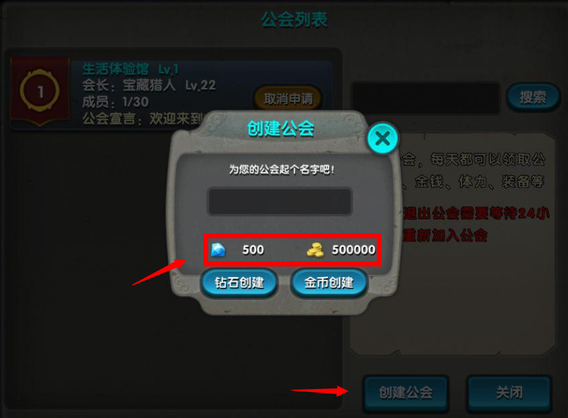 2、有两种创建方式:第一种是金币消耗50W第二种消耗钻石500个。所以在创建之前看好你包包里的银子哦!