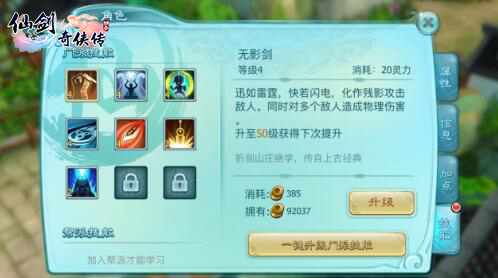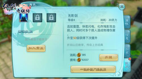 游戏主角拥有5个主要属性:力道、灵力、体质、耐力、身法。力道可以增加物理伤害,灵力可以增加法力、仙攻,体质可以增加生命、仙防、物防,耐力可以增加仙防、物防,身法可以增加仙防、物防、速度。角色技能共分为“门派技能”和“帮派技能“两种,其中门派技能需要角色等级达到一定级后获得,帮派技能需要玩家加入帮派后获得。