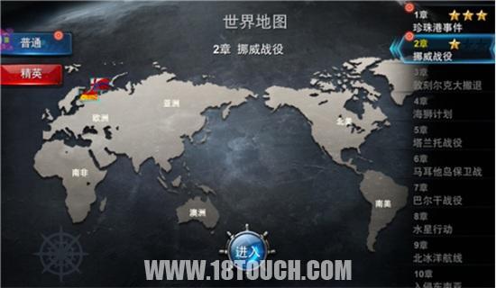 既然打着二战的背景,在主副本上自然是各大经典战役为主。游戏非常霸气的囊括了世界各国海域的战争事件,以世界地图的方式汇总呈献给玩家,每次挑战都是对历史的回顾,整个闯关过程就像是一场环球军事时光旅行,这个创意也为手游相对枯燥的副本增添了不少趣味。