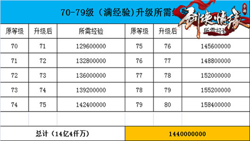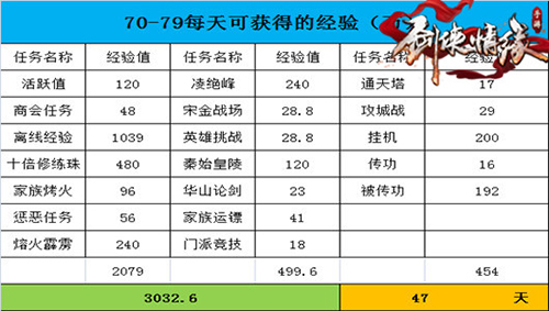 对以上所有的活动进行统计,得出,普通少侠一天可得经验约为3000W,从70升到79需42天,升到79满经验大概需47天,约4-5天升一级。