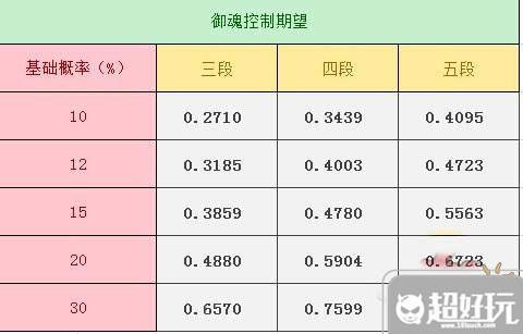 上面御魂基础概率分为五档,10%、12%、15%、20%、30%,那以这五档概率我分别算下三段、四段、五段伤害的控制期望(其他段数的攻击我就不考虑了,毕竟脸狐、二口女这种不稳定段数根本不会去打控制吧),为了大家看的方便,我做份表格: